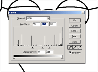 Now, goto "Image>Adjust>Levels". You'll have to experiment a bit to get the lines too look the way you want them too, it isn't too hard to move those sliders around a bit to make the lines smooth.(Click on the image there to see a bigger version)